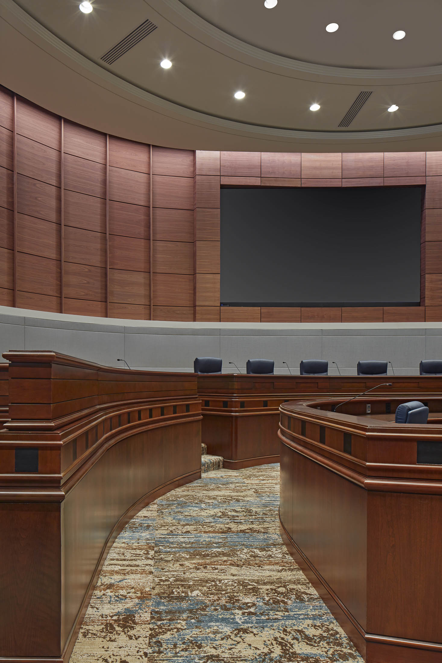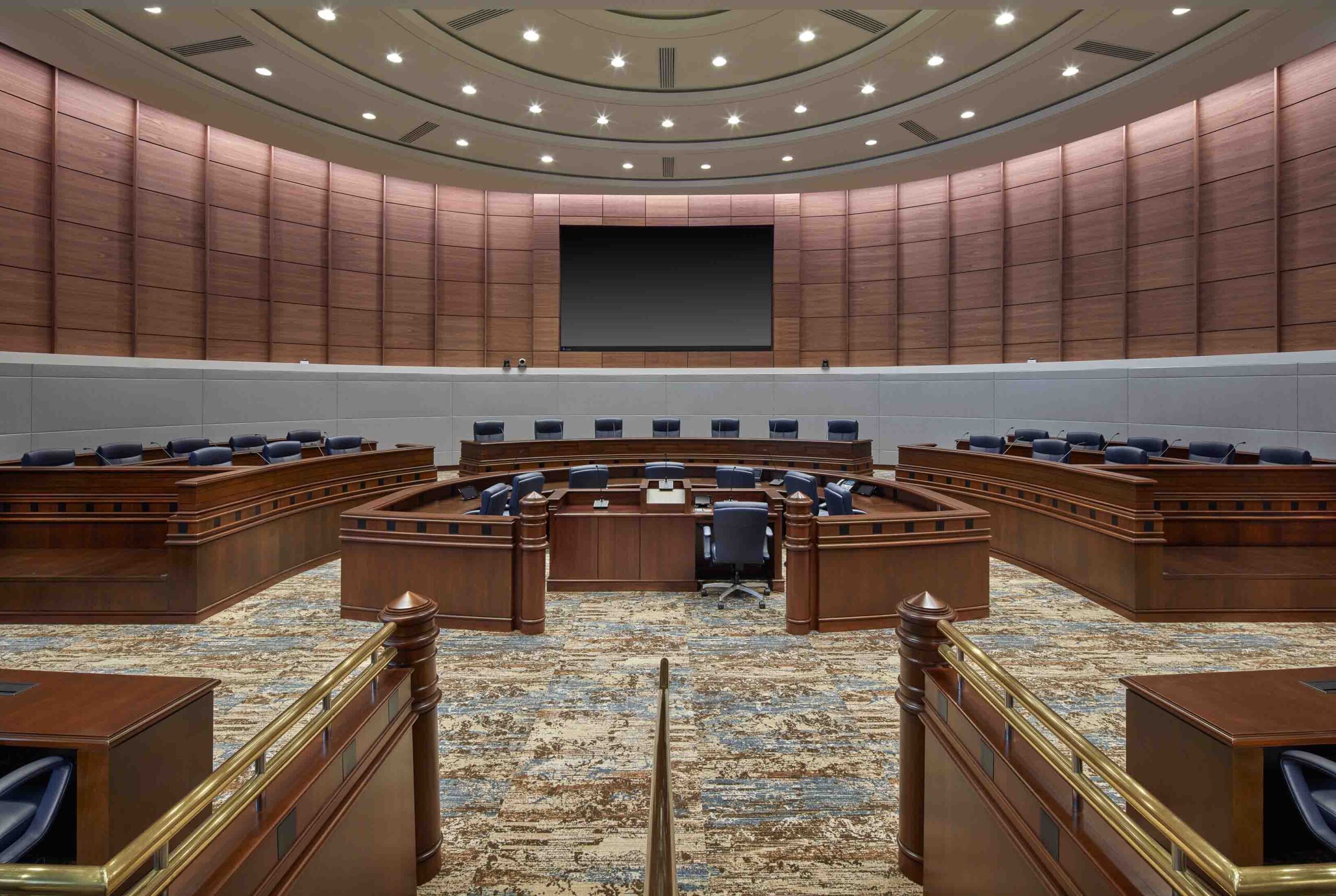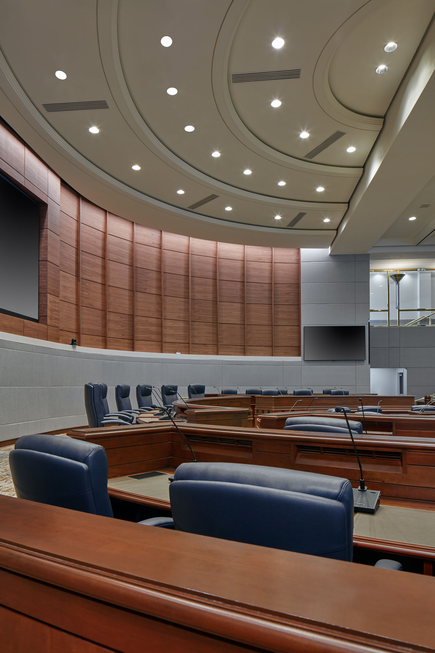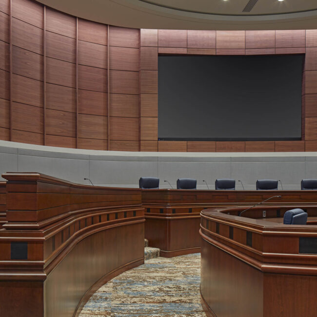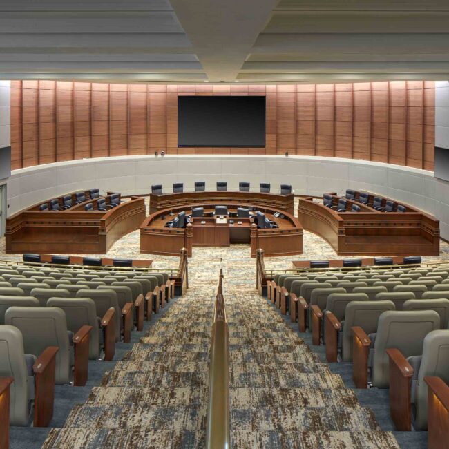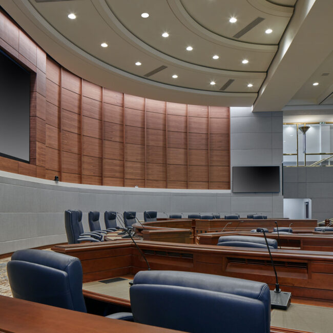 The project focused on upgrading interior finishes, seating, acoustics, lighting, and technology to support modern meeting needs. Enhancements were designed to improve sound quality, visibility, comfort, and operational efficiency while maintaining the civic character of the space. Advanced audio visual capabilities were incorporated to support closed captioning and video conferencing, enabling more inclusive and effective meeting management.
